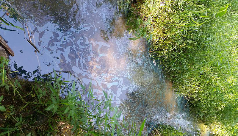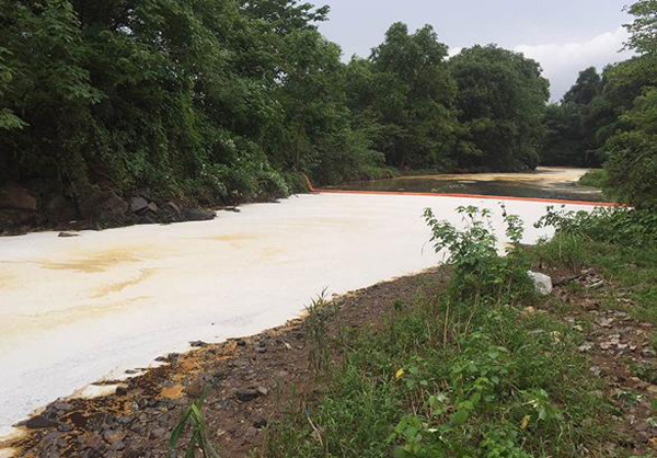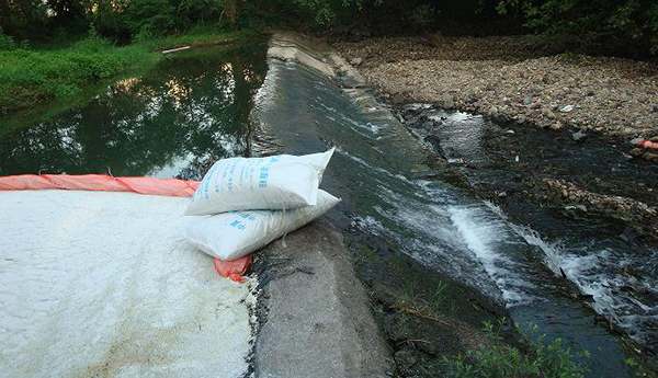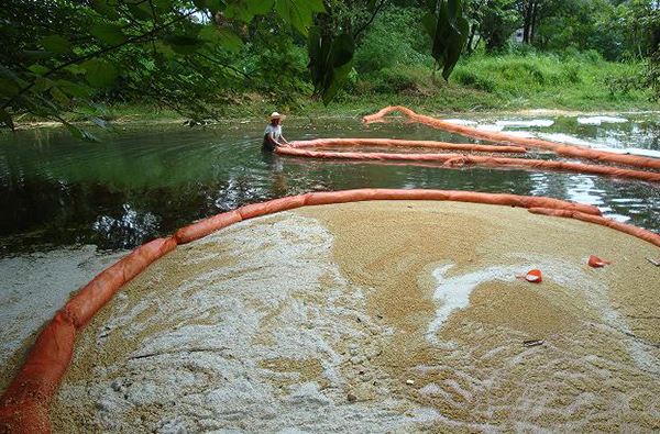 7月16日清晨5点。胡武军顾不上吃早饭,就驱车赶到上园水坝。水坝的围油栏没移位,水坝上方一大片原本洁白的吸油颗粒剂,又已变成黄褐色;而水坝拖栏下面的河水还是清澈涟涟,倒影如画,肉眼观察水面在阳光的照射下没有一丝油渍。他的心里的一块石头落了地。令人遗憾的事,高速路下的上游引水渠中,原来已被FG吸附包堆叠阻截的油污,昨夜却又被人掘开了口子,所封堵的油污又全部泄入永祥溪。所以水坝上游河面上原本已经清澈的河面,又出现大片油污。如果不是预先投放了惰性吸油颗粒剂和吸油围栏,这些油污就将泄入永祥溪下游危及到金华江、富春江钱塘江全线水系生态环境,次生环境灾害恶剧将重演。