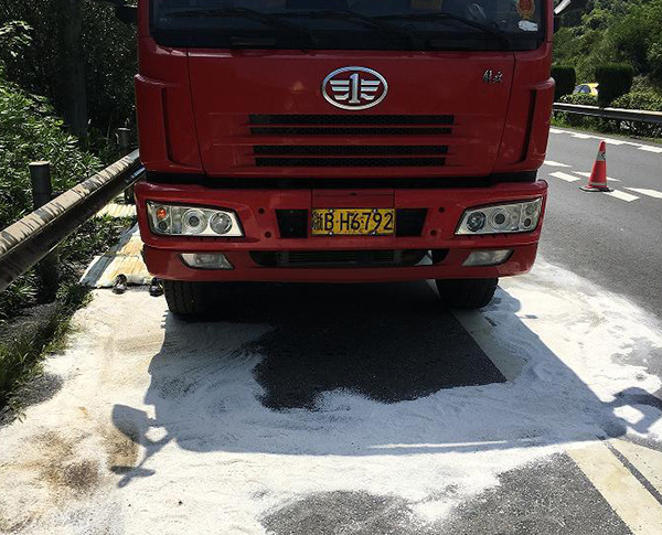 2016年7月15日凌晨。宁波滨海石化有限公司陈荣才,驾驶着浙B.H6792号槽罐车装载着18吨润滑油,行驶在G25长深(金丽温)高速公路上。当临近永康收费站约1公里路段傅店村桥附近时,他忽然听到车子不规则地异响,车身突然发出一阵震动,他下意识地一脚急刹车,槽罐车停在了路边的应急车道上。陈荣才下车检查,只见槽油罐底部的出油管破裂,油料哗哗地流淌到路上。油料沿着高速路的边坡向路坡下的排水沟流去。排水沟连接属地农田灌溉引水渠,渠的一端与一条小溪相接。他借着微弱的光线,俯下身查看,顿时吓出了一身的冷汗:原来是车子的传动轴断成了两截,其中一截断轴顶破了槽油罐卸油管阀门。机油从卸油管阀门前端哗哗泄出。陈荣才慌了神,拨通了公司的电话,但是深更半夜,公司一时联系不上。陈荣才急急忙忙脱下T恤衫,塞进槽罐下端的出油管口,那破口呈纵向裂缝,一件T恤衫根本就是无济于事。他脱光了裤子衣服,把泄漏油污的管道包紮起来。但油污还是汨汨地流向路面,流向路边的水沟。