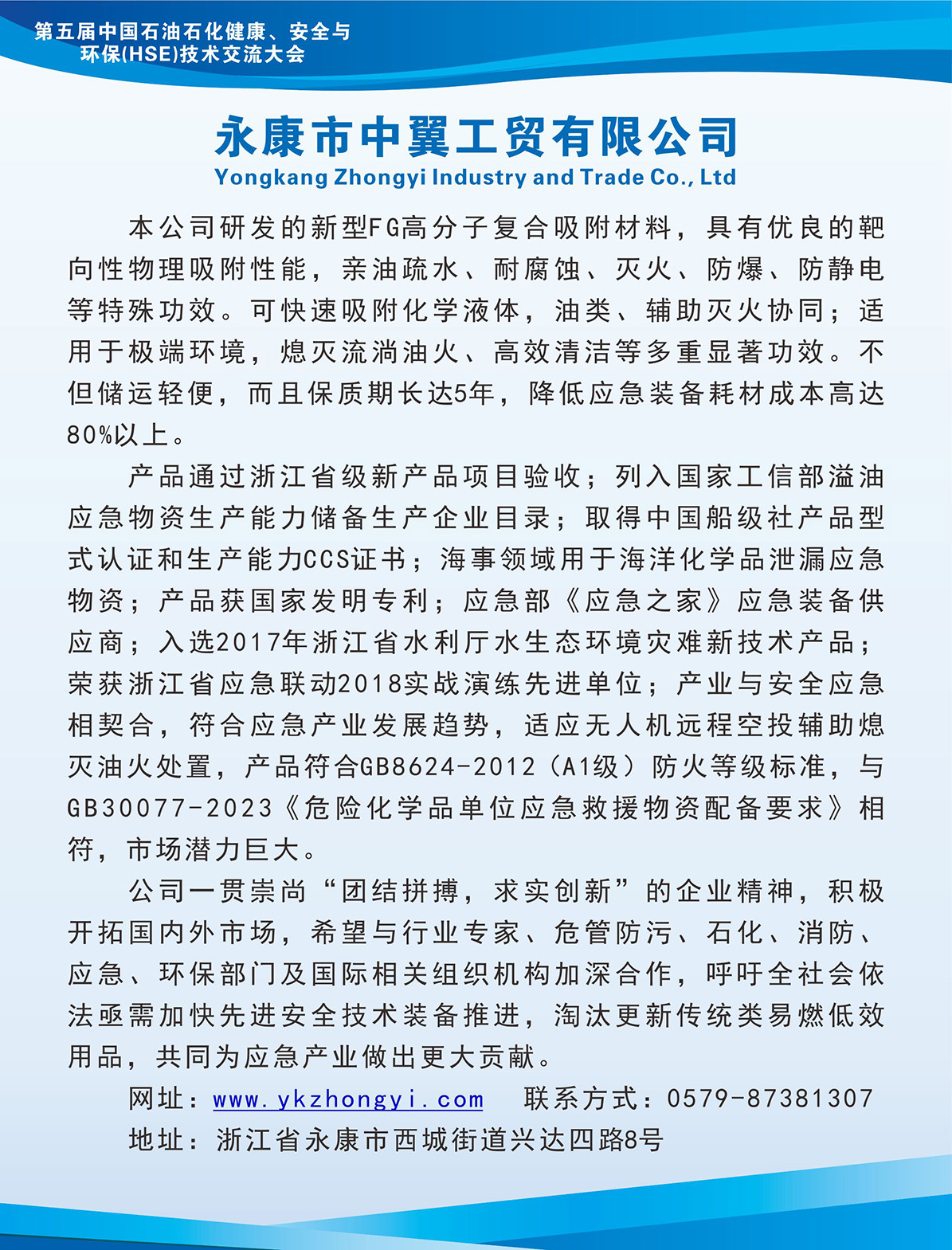 在北京召开了第五届中国石油石化健康、安全与环保(HSE)技术交流大会,永康市中翼工贸有限公司受邀参加,并把公司资讯印成彩页展示,彩页如下: