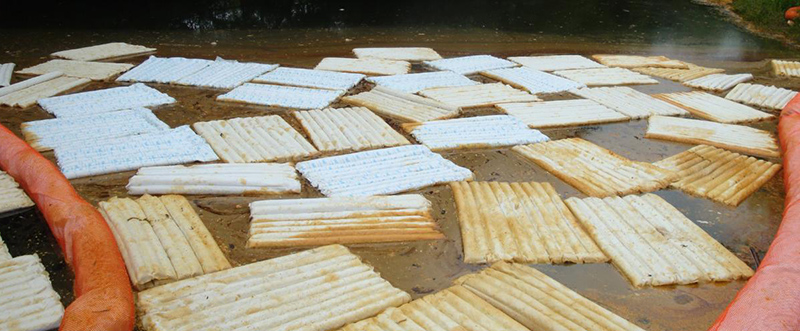 7月16日清晨5点。胡武军顾不上吃早饭,就驱车赶到上园水坝。水坝的围油栏没移位,水坝上方一大片原本洁白的吸油颗粒剂,又已变成黄褐色;而水坝拖栏下面的河水还是清澈涟涟,倒影如画,肉眼观察水面在阳光的照射下没有一丝油渍。他的心里的一块石头落了地。令人遗憾的事,高速路下的上游引水渠中,原来已被FG吸附包堆叠阻截的油污,昨夜却又被人掘开了口子,所封堵的油污又全部泄入永祥溪。所以水坝上游河面上原本已经清澈的河面,又出现大片油污。如果不是预先投放了惰性吸油颗粒剂和吸油围栏,这些油污就将泄入永祥溪下游危及到金华江、富春江钱塘江全线水系生态环境,次生环境灾害恶剧将重演。